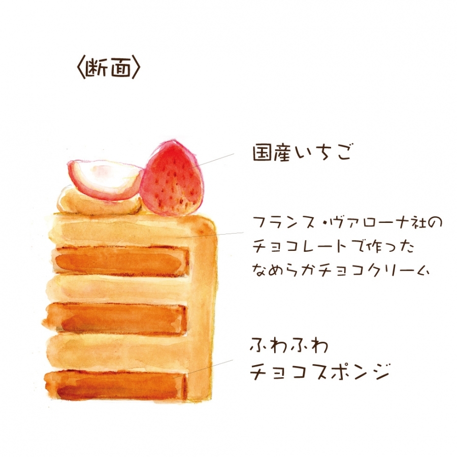 フランス産ヴァローナのチョコで作られたくちどけなめらかな特製ショコラクリームを存分に楽しめます。しっとりチョコスポンジとショコラクリーム、国産いちごとの相性抜群。とろけるおいしさです。