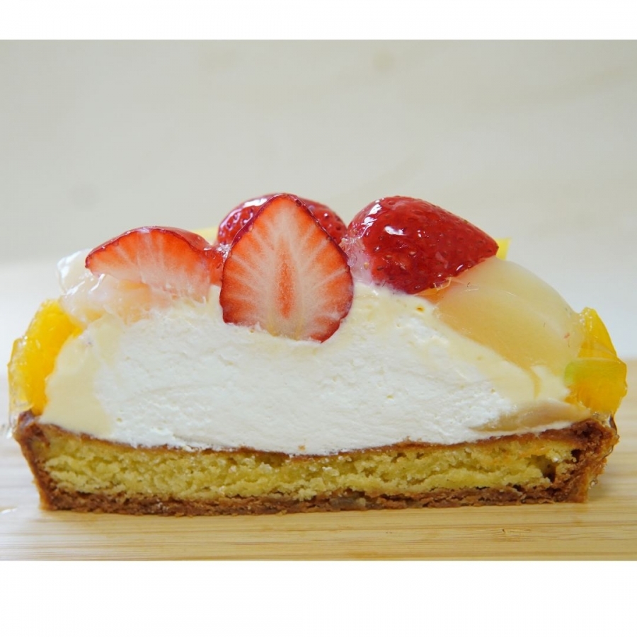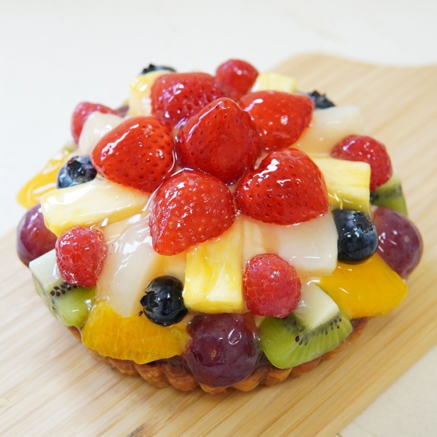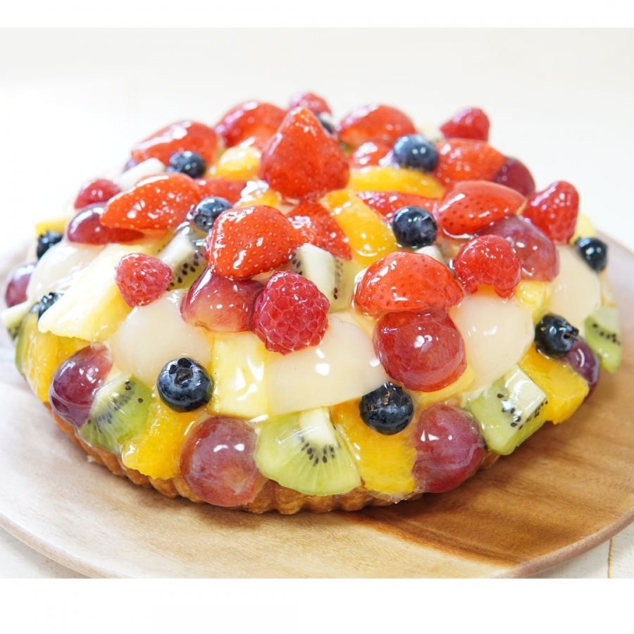 香ばしいダマンドタルトにカスタードクリームと生クリーム、色とりどりのフルーツをどっさり盛り付けました。